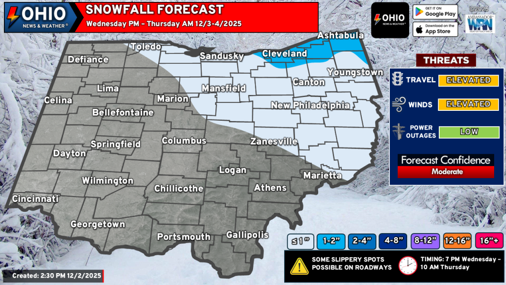 HOW MUCH: 1-2″ of snow may accumulate in the areas shaded in light blue. A few spots could see closer to 3″ in the higher terrain of Geauga County but this looks limited. In the areas outlined in white, generally 1/2″ or less for most areas. If you are outside of these areas, some light snow showers or flurries are possible with little to no accumulation expected.