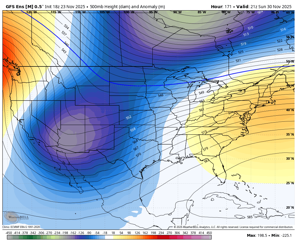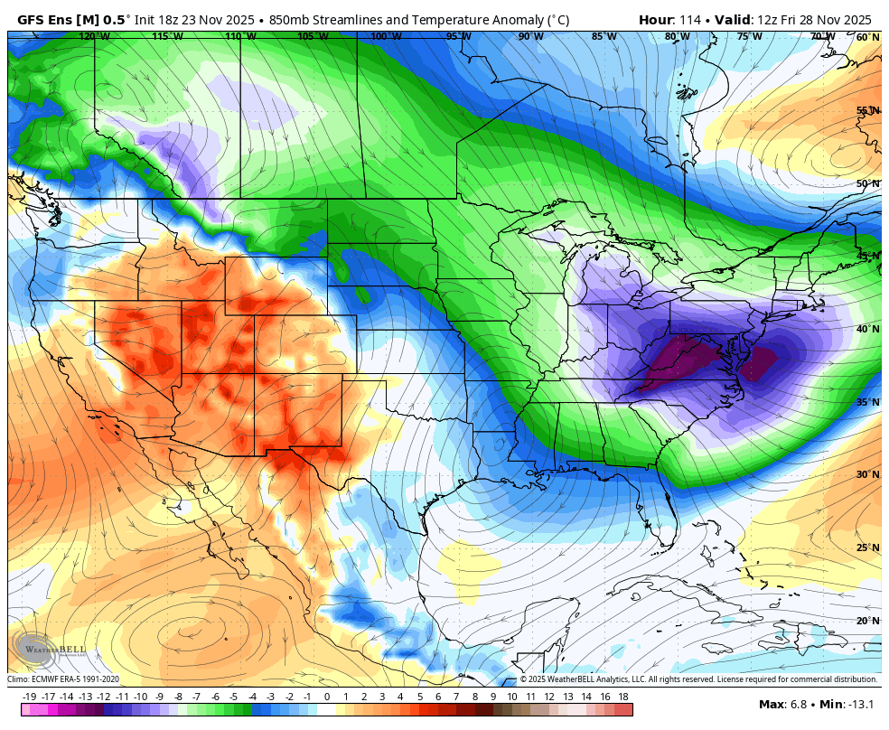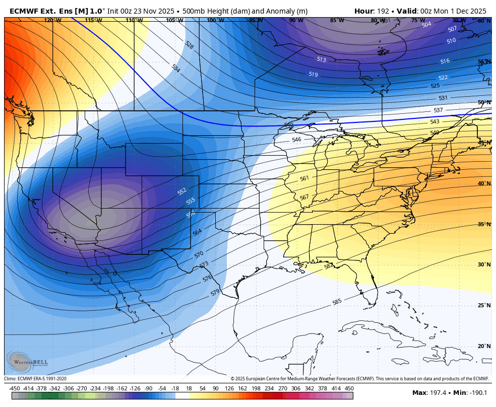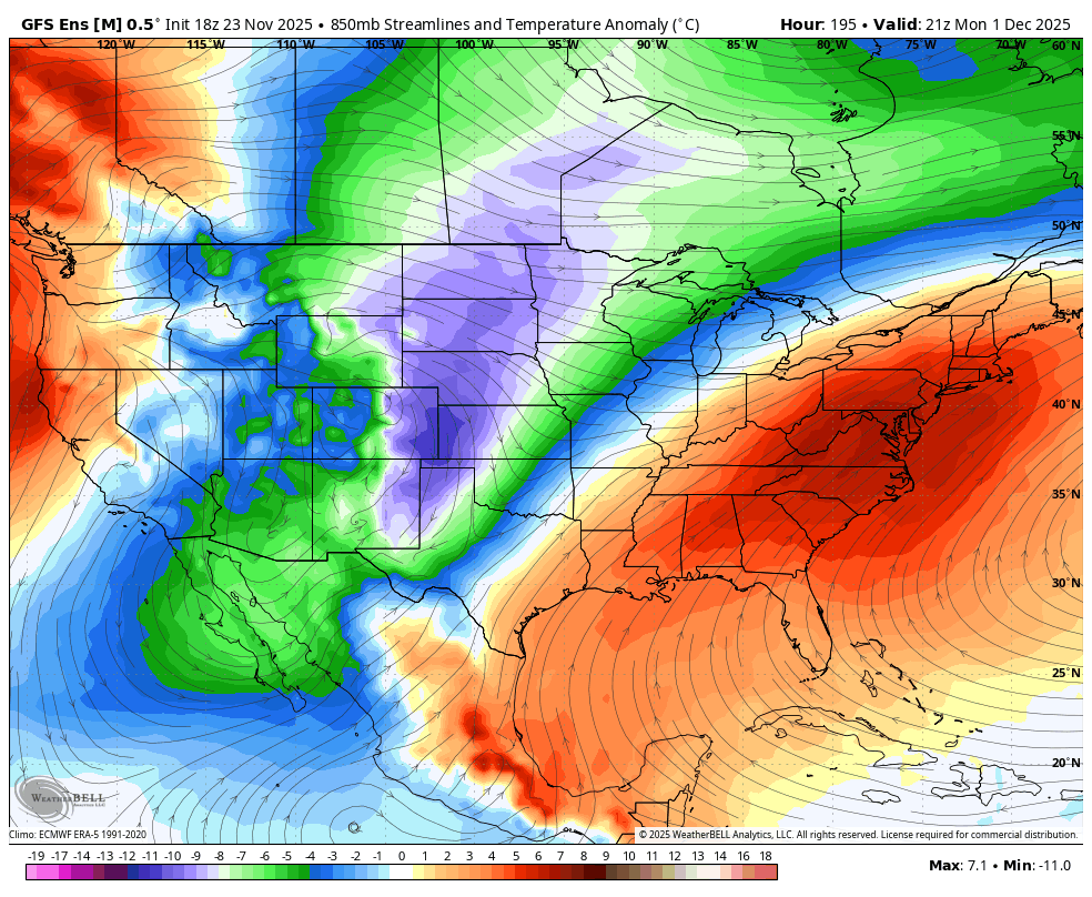 While turkey tetrazzini is cooking in the oven next week using up all of those leftovers, outside things are going to warm up next week as well. Ok, well it won’t be a scorcher, but warmer than average for early December. Cold air will drop across the Western US and warmer air will flow northward along the east coast. This will keep any ideas of “early December snow storms” in the Ohio Valley away since we’ll be above freezing. Instead, don’t pull out the shorts – we’ll see increased chances for rain.