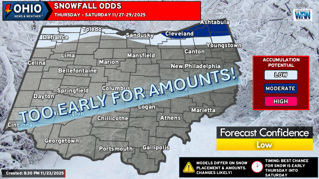 We will continue to monitor the latest model trends and provide further weather updates on snow for Thanksgiving in Ohio. And we’ll also post a snowfall map once we have enough confidence in timing, location and the amount of snow we can expect. Keep up to date on social media and our Winter Weather page.